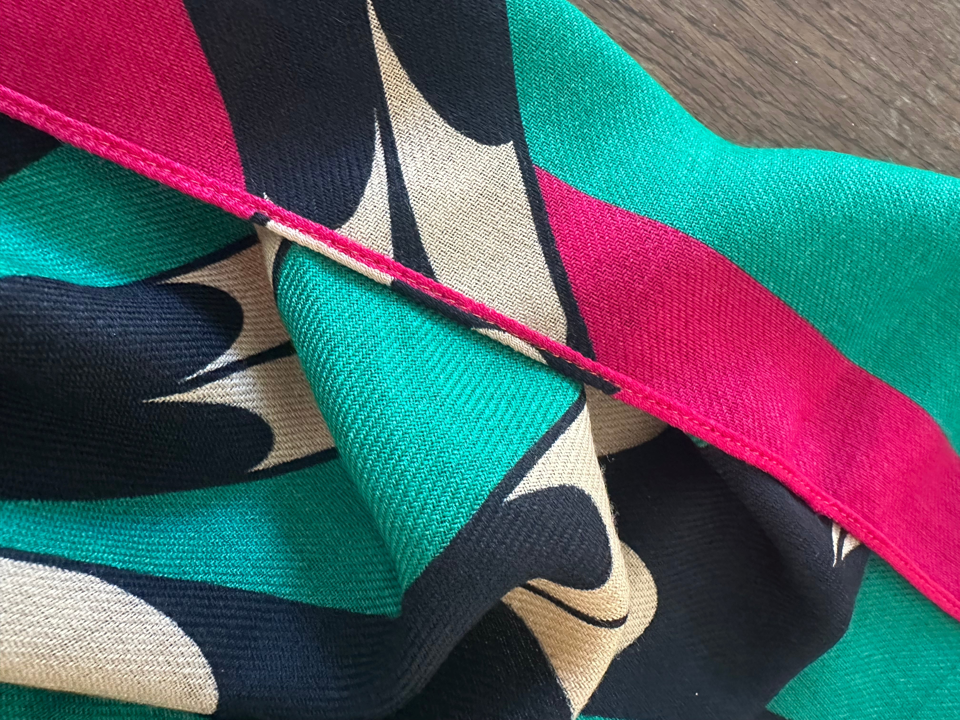 Le foulard L’Enchanteur Emeraude célèbre la richesse des couleurs à travers un motif envoûtant et contrasté. Dessiné à la main, il mêle un émeraude intense, du rose fuchsia éclatant, du prune envoutant et un orange vibrant, créant une composition hypnotique et lumineuse.