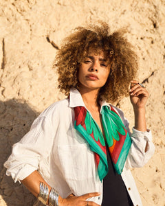 Our scarves are made from a cotton and silk blend, a perfect combination of natural comfort and subtle elegance. The cotton provides a soft and light texture, and the silk adds a touch of shine and fluidity that enhances the fabric.